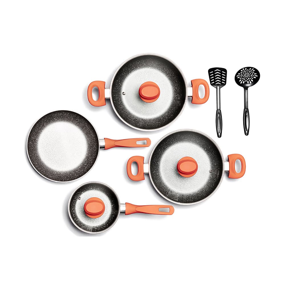 Se compone de: Budinera de 24 cm con tapa de vidrio + Olla de 24 cm con tapa de vidrio + Cazo de 16 cm con tapa de vidrio + Sartén de 24 cm + Espumadera + Volteador