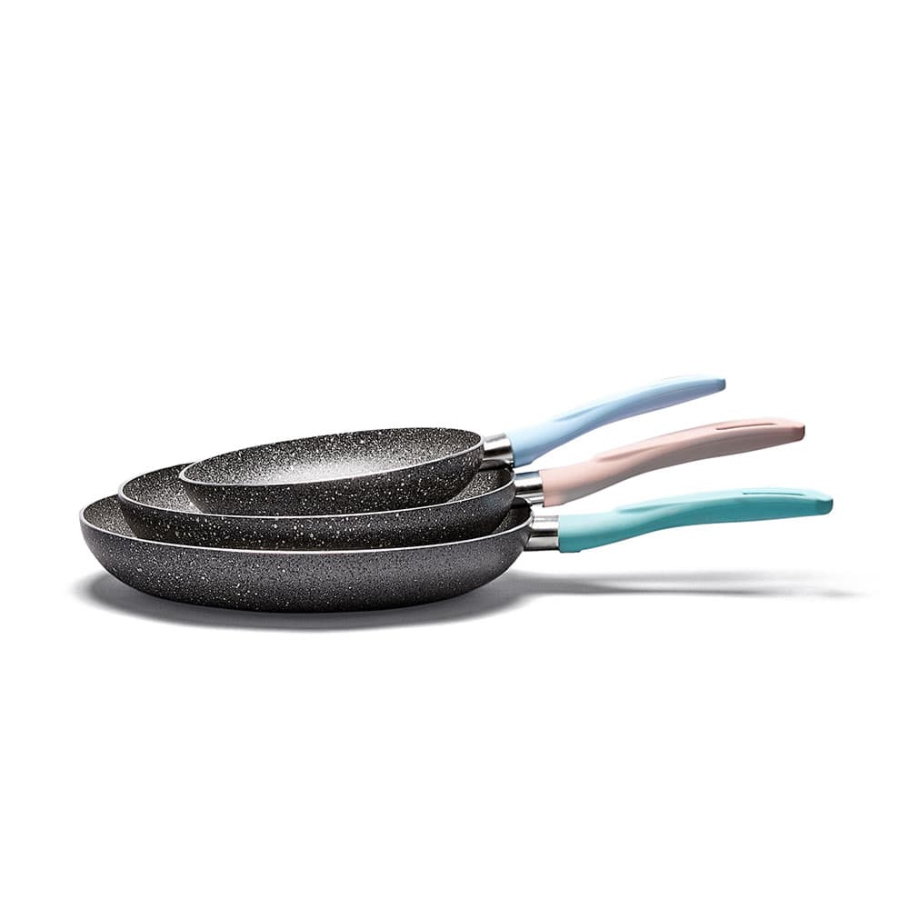 Se compone de: Sartén 20 cm con mango azul pastel + Sartén 26 cm con mango rosa pastel + Sartén 30 cm con mango verde pastel